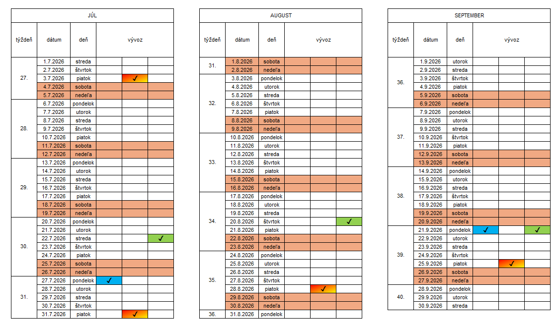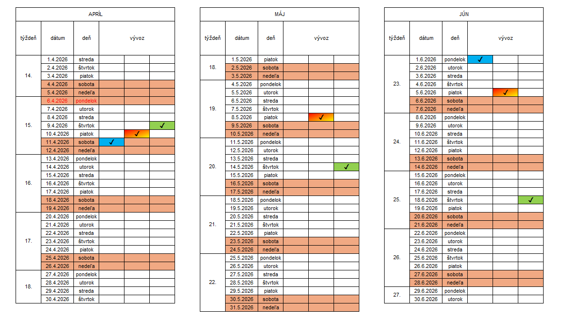 V prípade zmeny termínu vývozu z dôvodu štátnych sviatkov, alebo pamätných dní počas roka, ktoré pripadnú na stanovený termín, budú tieto oznámené cestou obecného rozhlasu.