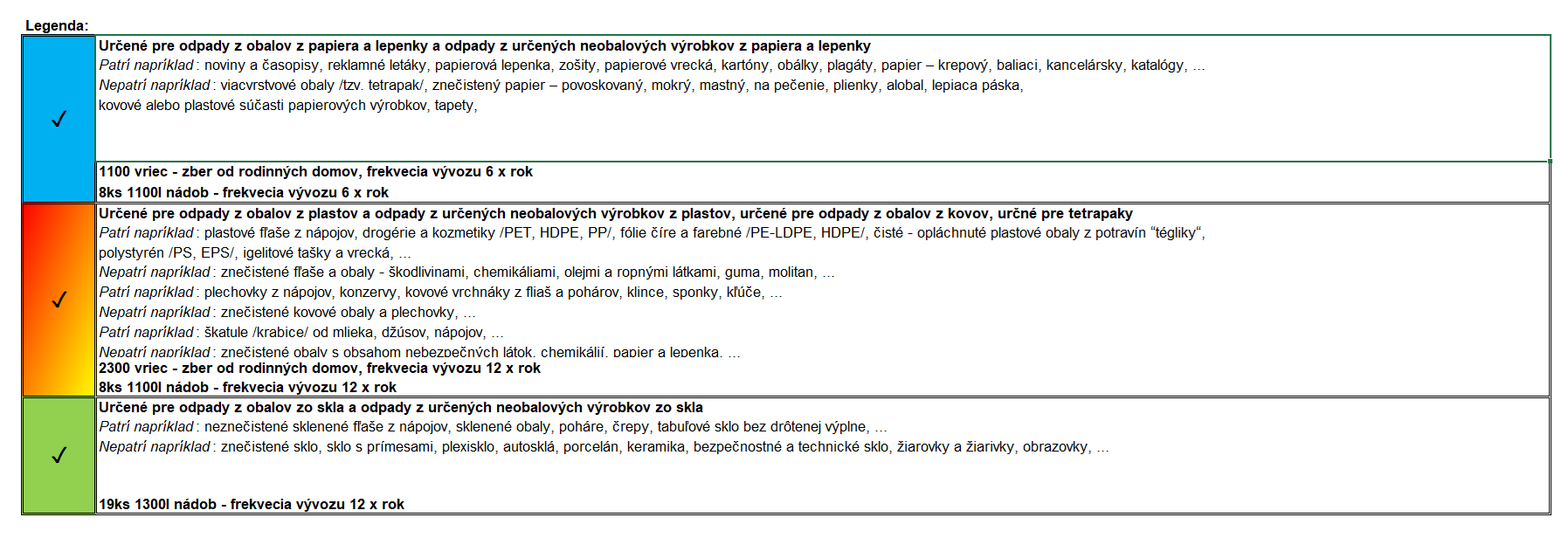 Nový zákon o odpadoch priniesol základné farby kontajnerov. Žltá je určená na plasty, modrá na papier, zelená na sklo, červená na kovy, oranžová na viacvrstvové kombinované materiály (tzv. tetrapaky). Aby ste si boli istí, čo kam môžete vhodiť, najlepším spôsobom je prečítať si štítky priamo na zberných nádobách. Tie musia obsahovať presné informácie o tom, čo všetko do konkrétnych nádob patrí.