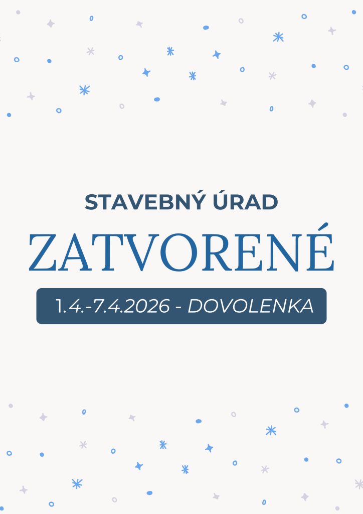 Vážení občania, z dôvodu čerpania dovolenky bude stavebný úrad v našej obci od 1. apríla do 7. apríla 2026 zatvorený. Ďakujeme za pochopenie.