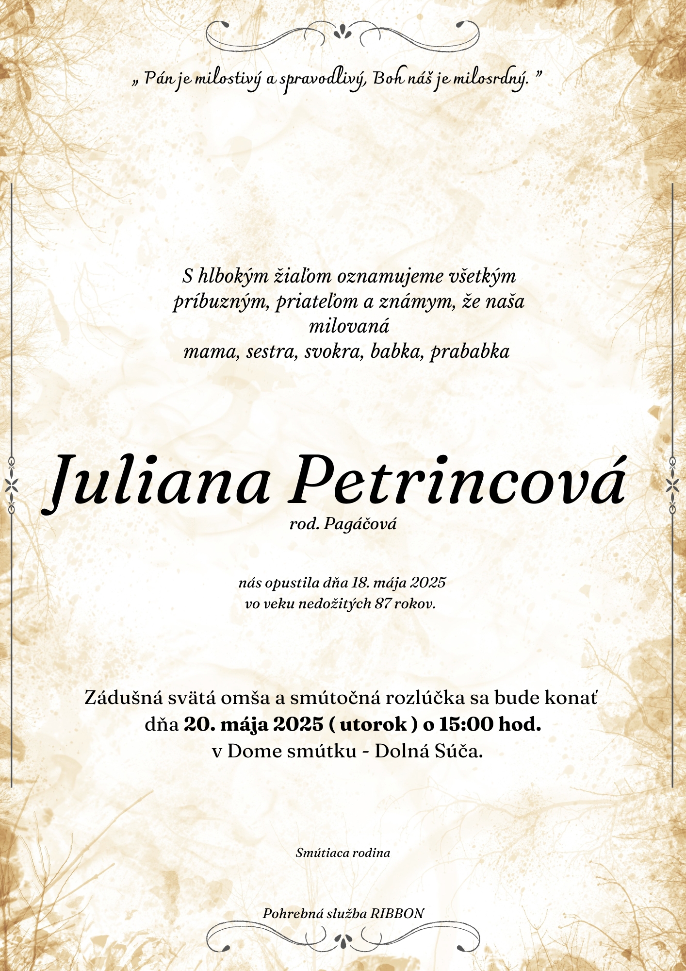 Smútočné oznámenie p. Juliana Petríncová 86r. Typ: JPG obrázok, Veľkosť: 1.77 MB